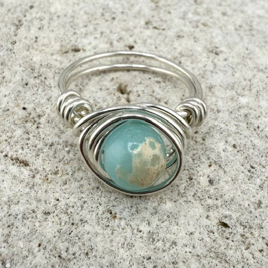 Aqua Sea Sediment Jasper Sterling Silver Wire Wrap Ring - Size N