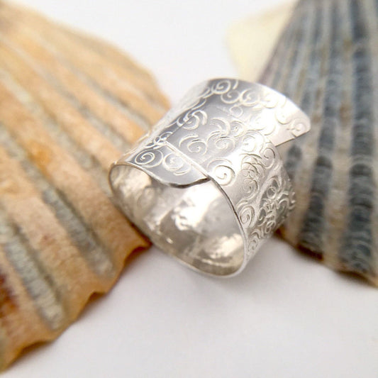 925 Sterling Silver Patterned Wide Wrap Over Ring