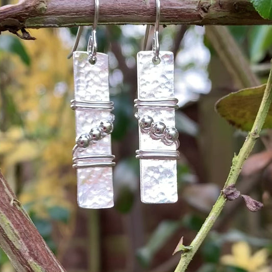 925 Sterling Silver Bead Wire Wrapped Hammered Dangle Earrings
