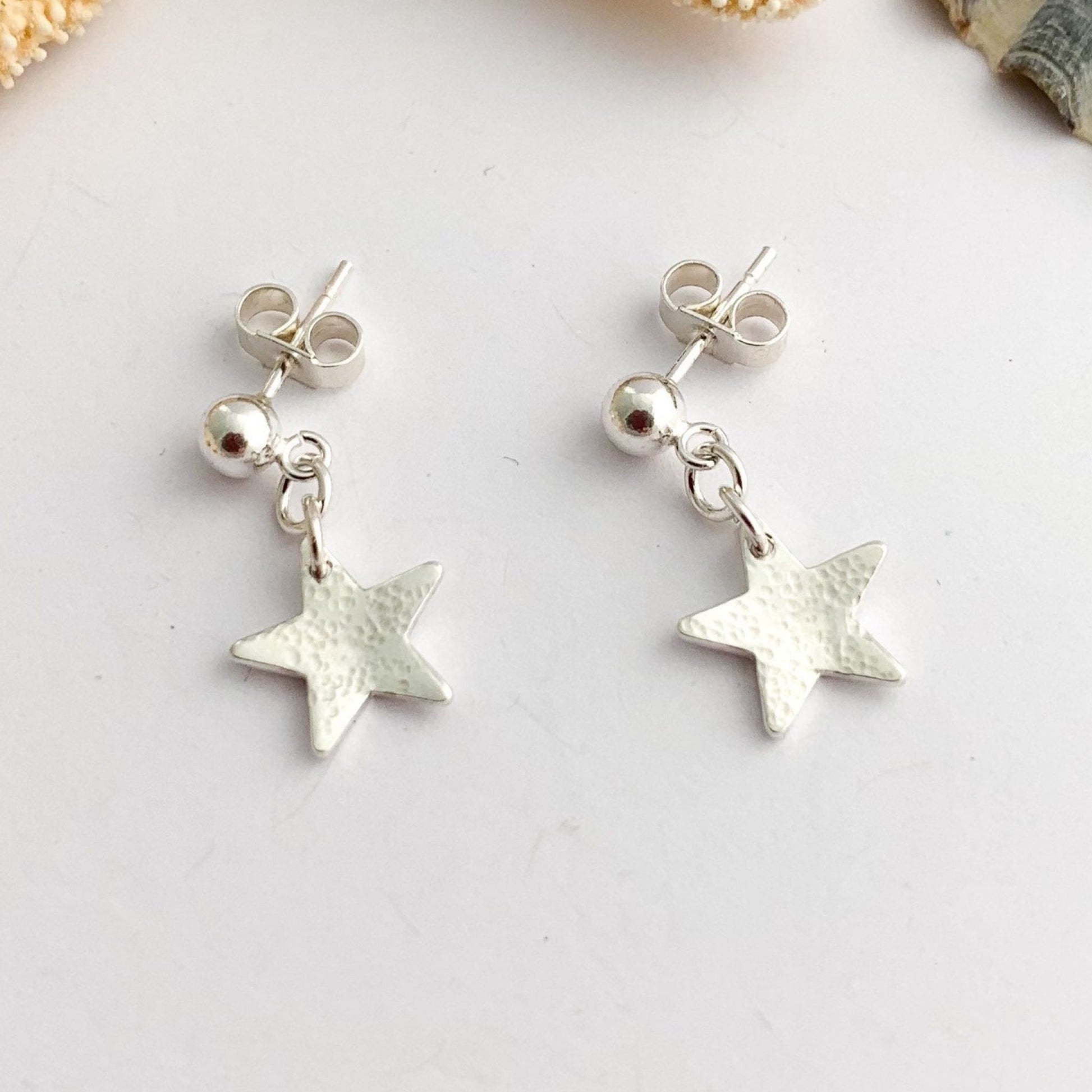 Lovely little star shape sterling silver stud earrings, delicate and lightly hammered. The drop earrings are very light to wear and are fastened with a silver ball stud and butterfly and pin. The earrings have been highly polished to give a lovely shine which catches the light as they move.