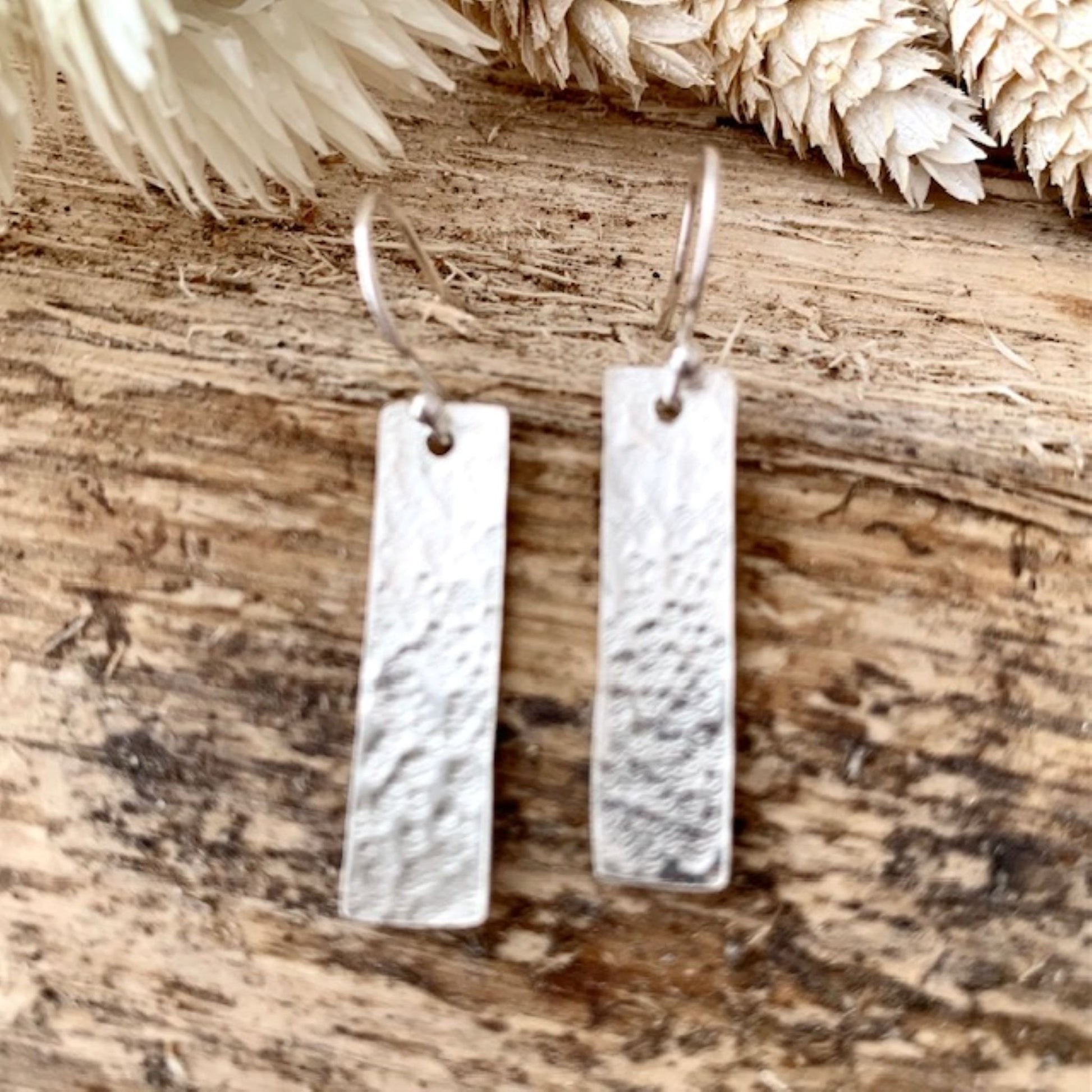 Lovely minimalist 925 sterling silver rectangle bar dangle earrings, hand forged and lightly hammered, hanging from sterling silver ear wires. These pretty stick earrings have been highly polished to give a lovely shine which reflects the light as they move.