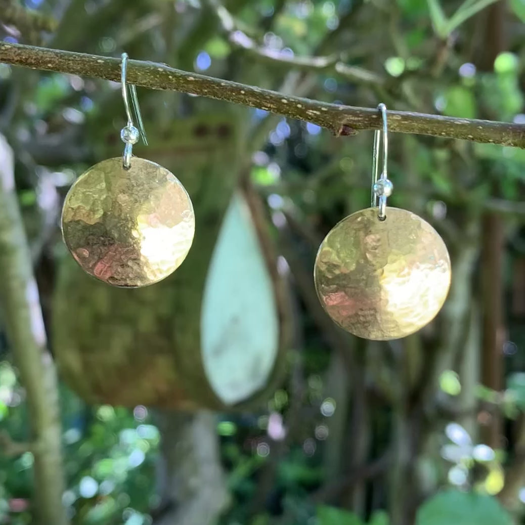 Enhance your everyday jewellery look with these pretty hammered brass disc earrings, handcrafted with care and precision. Each lightweight brass disc features a gently hammered texture and a high-polish finish that beautifully catches the light as they move. They hang gracefully from sterling silver ear wires, creating a simple yet striking accessory.